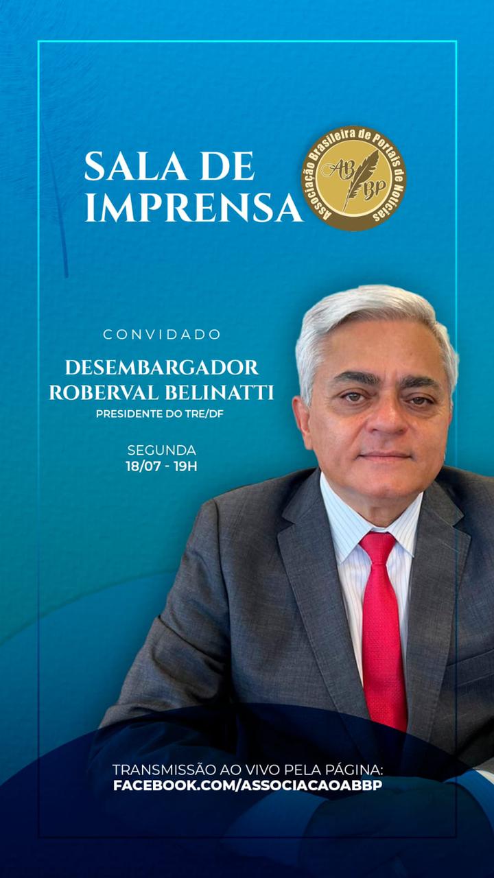 O desembargador eleitoral Roberval Belinati, presidente do Tribunal Regional Eleitoral do Distrito Federal (TRE-DF), é o convidado da Sala de Imprensa da Associação Brasileira de Portais de Notícias (ABBP), na próxima segunda-feira (18), às 19h