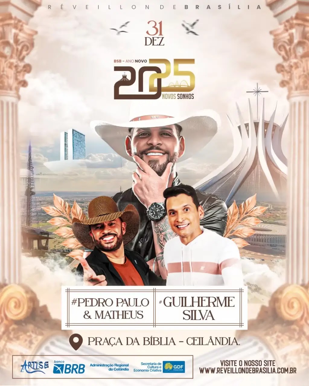 - Réveillon na Esplanada dos Ministérios: A partir das 18h, venha celebrar o Ano Novo com shows de DJ Jovic, Banda Artise e CIA, Giraya Uai, Zé Vaqueiro e o lendário Leonardo!